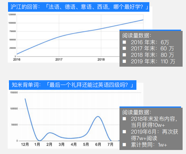来看一下两条优质内容的案例,大家就会更加清晰地明白内容池的超长待机、反复激活、持续传播和持久效果。“法语、德语、意语、西语哪个最好学?”和“最后一个礼拜还能过英语四级吗?”分别是沪江和知米两个品牌创作的优质问答内容,不同于当前典型的短期流量转化效果,这两条内容从发布之日起至今的几年之内,一直持续地为品牌带来了源源不断的流量。这就是品牌要打造内容池的根本原因。