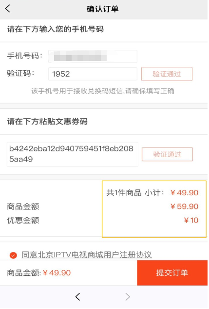 ③ 使用手机微信扫描电视屏幕的二维码,进入【北京IPTV手机商城】,点击【立即购买】,进入输入信息的页面,完成手机号验证后,在下方粘贴刚刚复制的优惠券码,验证通过后,商品金额变成优惠后的金额,直接支付即可。