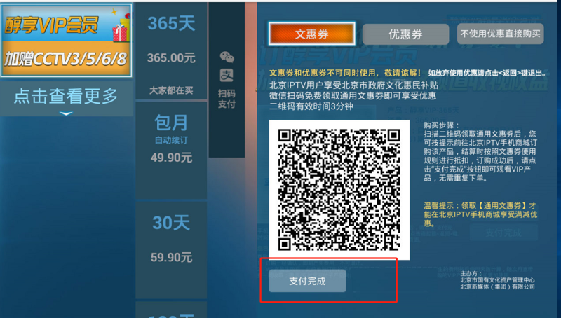 如果您在订购页右侧没有找到【文惠券】相关的文字说明和二维码,可能是您家IPTV版本过低,请断电重启机顶盒进行升级后再次尝试。