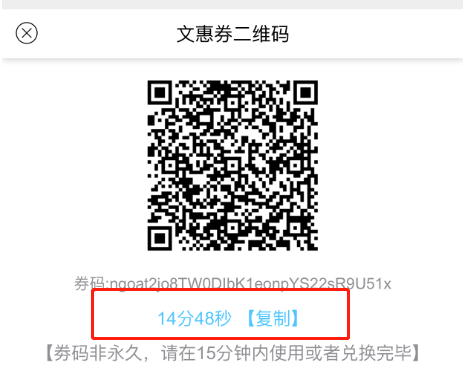① 打开手机微信,进入【北京文惠卡官方服务号】,点击右下角【我的文惠】,进入【我的券包】,找到10元通用文惠券,点击【查看文惠券二维码】,复制券码。