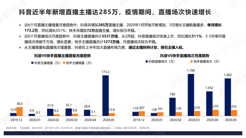 平台上的主播激增,抖音上的增长尤为迅猛。据面朝科技发布的《2020年直播电商数据报告-抖音VS快手》,2019年12月-2020年5月,抖音增加了285万名直播主播、共计5531万场直播,快手共增加72万名直播主播、共计1273万场直播。