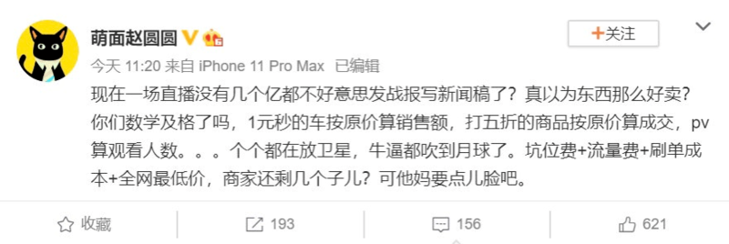 “现在一场直播没有几个亿都不好意思发战报写新闻稿了。”今年6月,赵圆圆曾发微博指出直播带货的巨大泡沫。