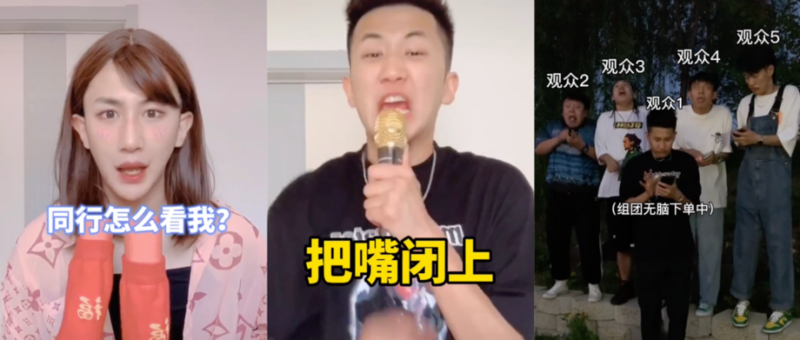 与之相对的,抖音、快手这两个月也出现了大量吐槽直播带货套路的视频。以“郭仙人”为代表,他7月开始创作此类视频,单个视频的抖音点赞量高达166万,其原创梗“把嘴给我闭上”也产生了大量二次创作内容。