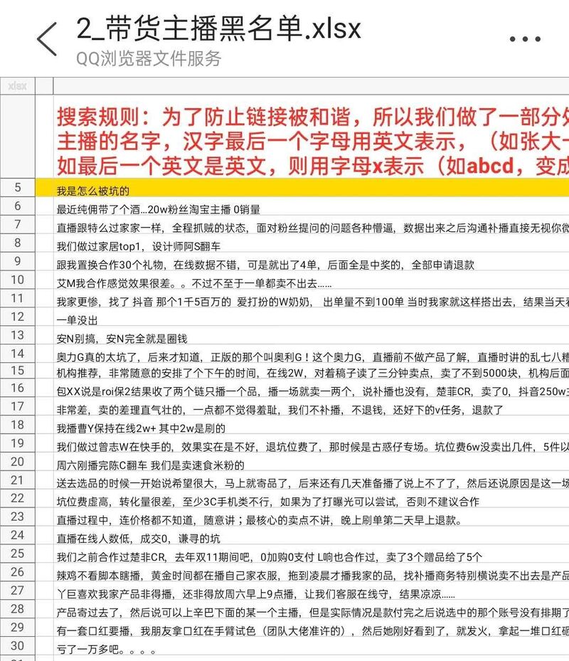不仅是媒体热度下降,行业内还进行了“揭短”接力赛。近日,微信群传出一份由多位商家撰写的带货主播黑名单,描述了他们在直播带货中遇到的“坑”,如直播前两小时样品被主播砸坏、坑位费太高销售额却很低等等。
