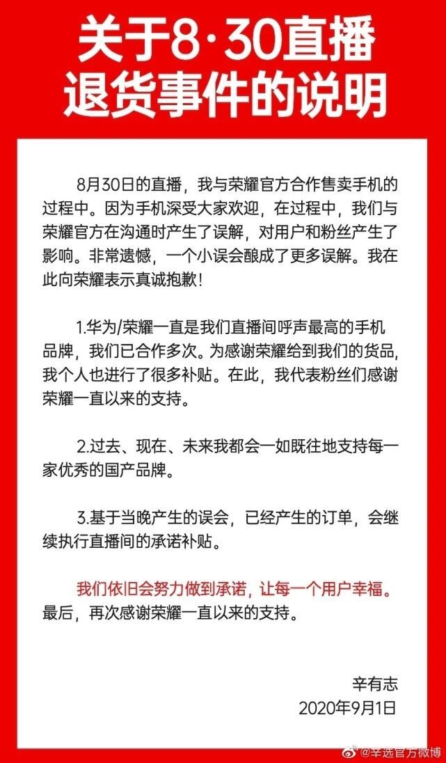 8月30日,快手头部主播辛巴上了热搜,当晚辛巴带货荣耀手机,每款降价300元,他临时要求荣耀多赠送一副耳机,荣耀拒绝。辛巴称,“我亏了4000万交你这个品牌都没交下,不好意思我不交了。”不少网友支持荣耀,认为大公司有自己的审批流程。9月1日,辛巴发文道歉,称己方只是与荣耀官方沟通时“产生了误解”。