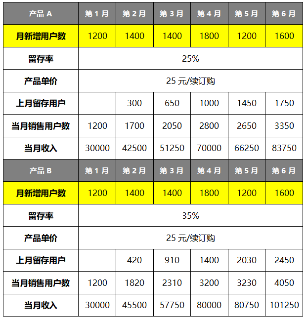 4、从营业收入角度来说,我们来看下面两组数据:假设产品A和产品B每月新增都为同样一组数据,新用户次月按照25%留存率计算且之后不流失。半年后产品A总收入为343750元,产品B总收入为395250元,即产品留存率提升10%,半年时间整体收入产品B比产品A多近15%。所以,提高用户留存率是实现增值业务收入提升的又一重要机会点。