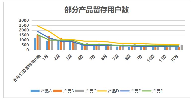 以上图片是五个产品的全年用户留存情况,我们对留存进行分析通常是以月为单元,观察某月的新增用户在随后每月的留存情况。图中我们可以看出,用户随时间推移的留存会明显的出现三个时期。
