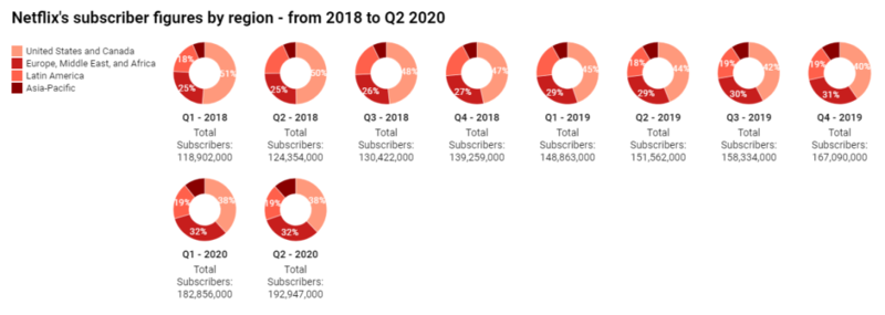 截至2020年第二季度,Netflix全球总用户数达到1.93亿,其中美国和加拿大地区付费用户占达到7332万(38%),而欧洲、中东和非洲、拉丁美洲、亚太等国际市场用户达到1.2亿(62%)左右。
