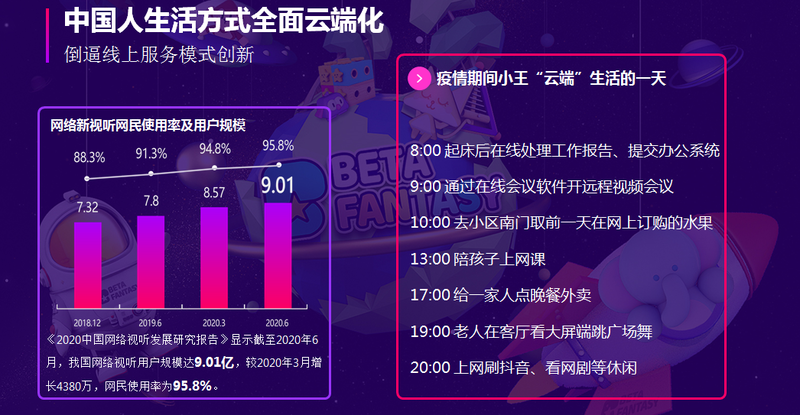 在疫情的影响下“线上+”场景进一步多元化,并逐渐打通娱乐、办公、医疗、生鲜、教育等多个领域,整个视听行业也都迎来了流量高峰。