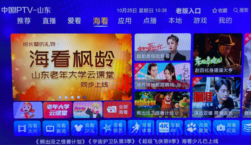 10月25日,山东老年大学、山东广播电视台战略合作签约仪式暨山东海看IPTV“海看枫龄” 产品发布会在山东广播电视台举行。根据协议,在海看IPTV平台开设“山东老年大学云课堂”,同步山东老年大学在线课程,“山东老年大学云课堂”也将成为全国首个覆盖省域的家庭端老年远程教育平台。