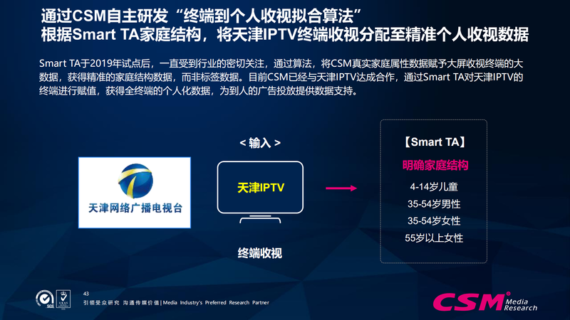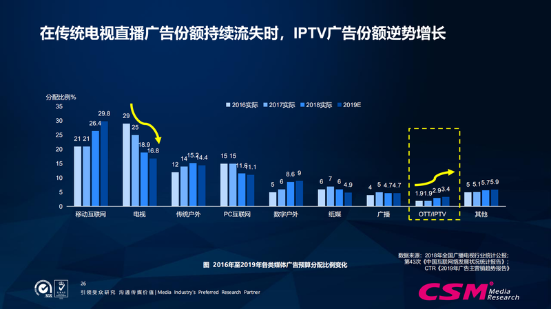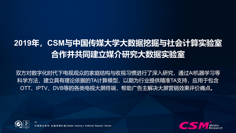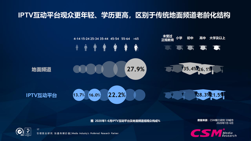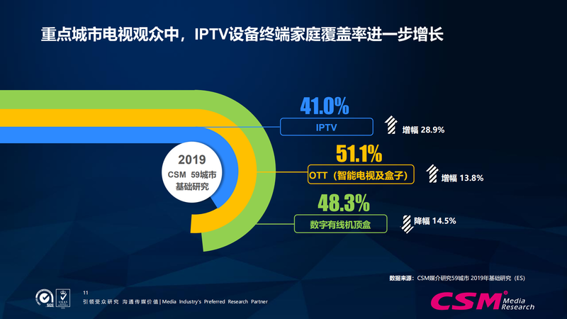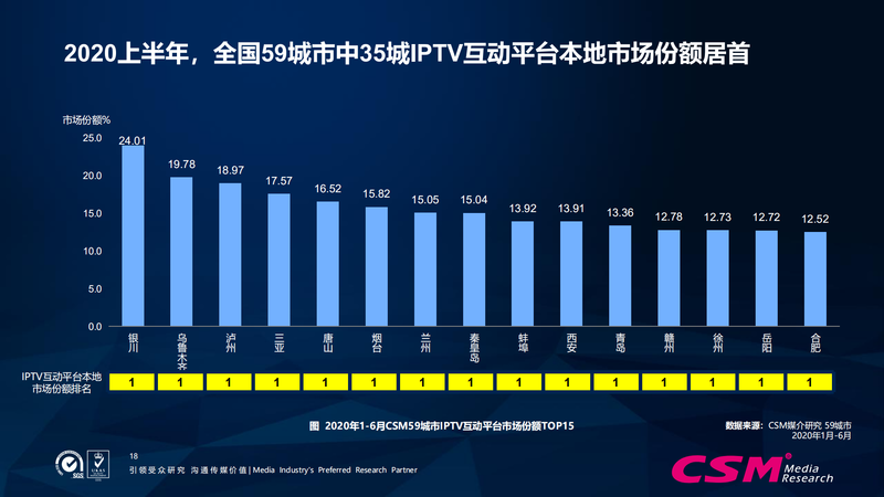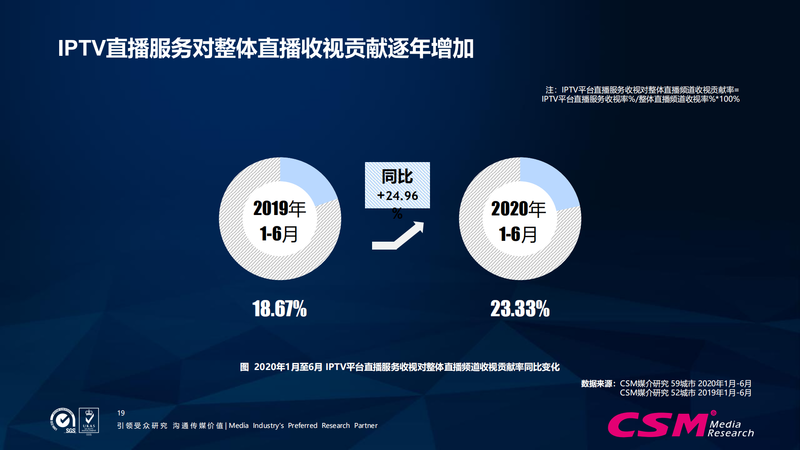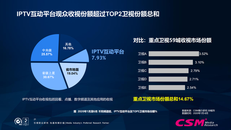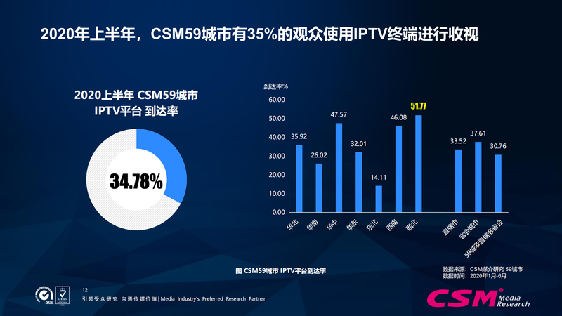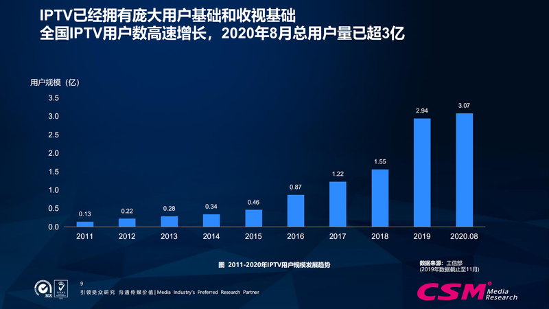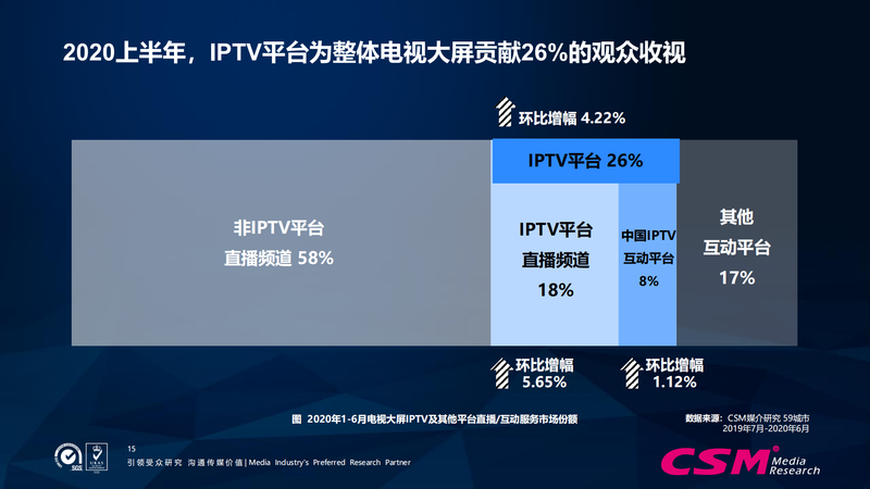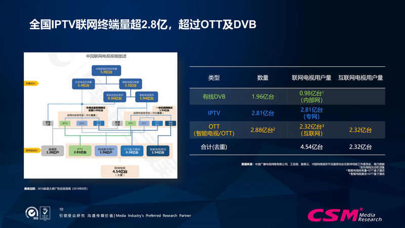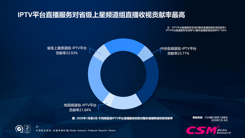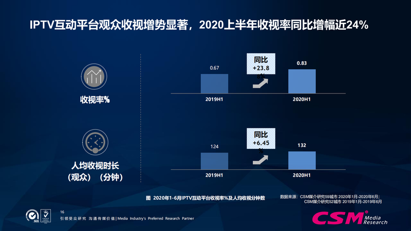IPTV在传统媒体产业融合发展中的重要地位。目前全国IPTV用户数高速增长,2020年8月总用户量已超3亿。全国IPTV联网终端量超2.8亿,超过OTT及DVB。重点城市电视观众中,IPTV设备终端家庭覆盖率进一步增长,2019年同比增长28.9%,占比达到41%。2020年上半年,CSM59城市有35%的观众使用IPTV终端进行收视,在14个城市IPTV的触达超过50%观众,银川地区近78%,这个数字是非常惊人的。(更多PPT请点击:VIP频道)
