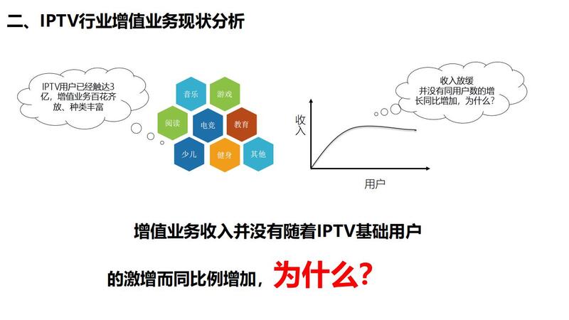 IPTV快速增长期,在各项业务粗放式增长之后,增值业务已经到了一个分水岭,到了规模红利向运营红利转型的关键节点,要求从业人员依托新技术、创新思维,静下心、沉下气去开发精品,避免同质化竞争,为IPTV行业长久健康发展做出实际行动。(更多PPT请点击:VIP频道)