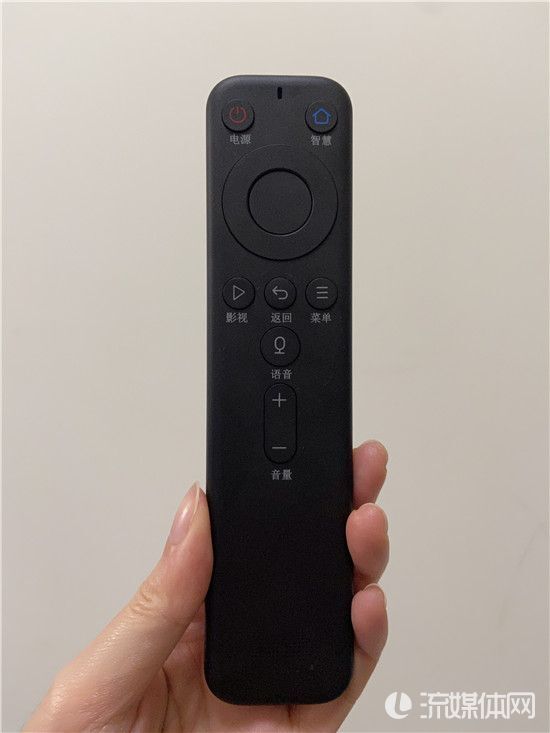 遥控器较为灵敏,反应快速。单独设置了“智慧键”和“影视键”,前者可直接进入智慧屏界面(即智慧家庭相关服务),后者可直接进入娱乐屏界面(即开机首界面)。此外遥控器上还设置了一个“语音键”,需要按住该按键才能激活语音功能。