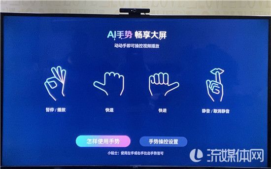 基于天猫智慧屏魔盒上的摄像头,用户可以通过手势对正在播放的视频内容进行一系列手势操作,如暂停/播放、快退、快进、静音/取消静音。只需要对准摄像头做出相应动作,就可以进行便捷操作,反应较快,对于还不会使用遥控器的小孩子而言较适用。