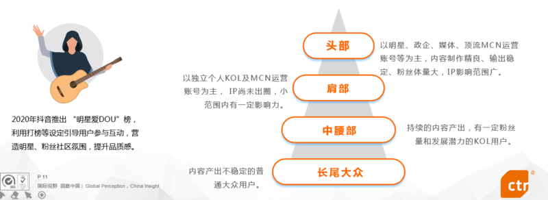 内容格局:明星、民间网红与素人同台,阶梯式打造品质化营销氛围短视频平台正在从民间素人网红聚集地向多层次内容和KOL孵化中心过渡。由于短视频以UGC内容和民间网红为起点,营销环境缺乏品质感一直被行业所诟病。2020年以来,短视频平台陆续开始引入明星流量和专业内容。以抖音为例,2020年推出“明星爱DOU榜”大幅开拓明星流量。相关数据显示,截至2020年9月16日,抖音已入驻2740位明星。这将使平台的专业属性和品质感得到强化,从而打造品质化的营销氛围,获得更多品牌广告主的青睐。