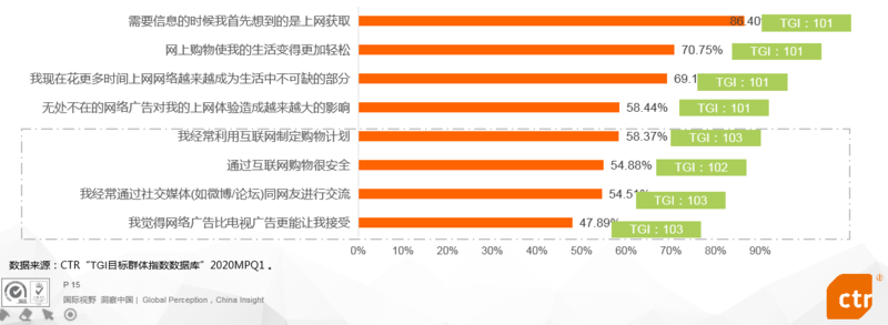 相对整体网民而言,短视频用户对网络广告和网购的接受程度更高,且更乐于通过互联网社交渠道(如微博、论坛等)与网友进行交流。