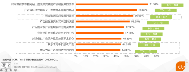 超过七成的用户会主动搜索感兴趣的产品和服务,但广告在促进用户购买上的作用仍比较明显,五成左右的用户承认广告带来了相应的信任感,同时激发用户对产品或品牌的购买意愿。