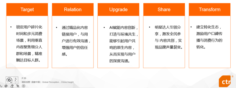 2019年,抖音为响应广告主的全链路营销需求,提出短视频营销的“TRUST模型”,阐述了短视频平台从聚焦用户、建立强关系、创新营销、传播扩散到占领消费者心智、完成转化等全流程的营销策略。