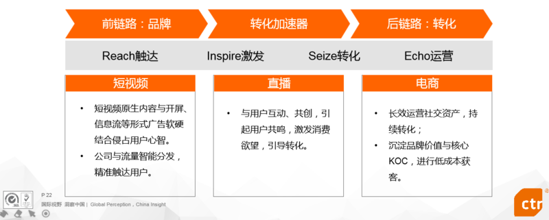 其中,“短视频+直播“形成以前链路为核心的转化闭环,”直播+电商”则形成以后链路为主的转化闭环。