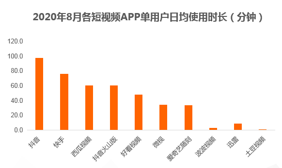 从用户时长看,抖音、快手、西瓜和抖音火山版的单用户日均使用时长指标已超过一小时,中腰部各应用差距相对较小,竞争更为激烈。