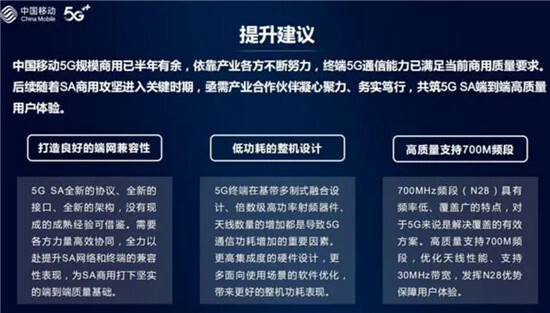 报告对最新上市的5G手机进行了评测,最终从提升5G行业整体通信质量提出了三条建设性意见。其中有一条是要高质量支持700M频段。强调700M频段具有频率低、覆盖广的特点,对于5G来说是解决覆盖的有效方案,高质量支持700M频段,优化天线性能,支持30MHz带宽,发挥N28优势保障用户体验。