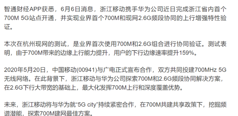 除了这几个动作,小编还想起了今年6月的一个新闻报道:中国移动携手华为开通首个700M 5G基站。当时这个新闻可以说铺满了整个通信圈。