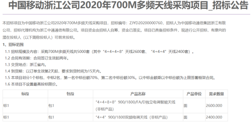 前几日有媒体报道称,中国移动集团浙江公司日前启动2020年700M多频天线采购项目。共5000套,其中“4+4+8+8”900/1800/FA/D独立电调智能天线(非标产品)2600套,“4+4”900/1800双频电调天线(非标产品)2400套。