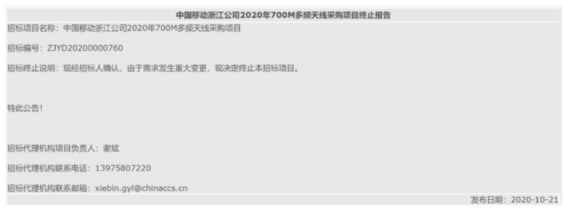 但是令人费解的是,小编在工信部相关招投标信息管理平台上查询到该招标项目终止了!招标终止的原因是招标人需求发生重大变更!这到底是主动终止,还是被动终止,读者朋友自行去体会。小编想问的是,为啥移动要大规模采购700M天线?究竟在打什么算盘?