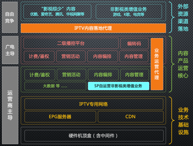 无论是从业务发展的历程来看,还是从运营商及广电的运营模式来看,这种状况的形成有其历史的必然,但同时也催生了IPTV封闭体系下内容落地代理和业务运营代理公司的模式。这些公司借助其技术积累、与广电及运营商省公司长期合作建立的信任,成为IPTV割裂封闭业务技术体系中最特殊也是最重要的组成部分。