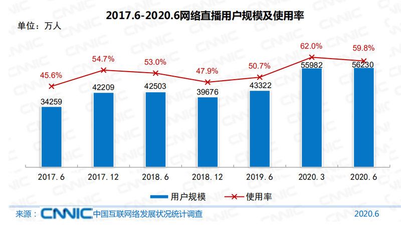 CNNIC发布的第46次《中国互联网络发展状况统计报告》显示,截至今年6月,我国网络直播用户规模达5.62亿,占网民整体的59.8%。其中,电商直播作为新业态的典型代表,用户规模达3.09亿,占网民整体的32.9%,成为上半年增长最快的个人互联网应用。