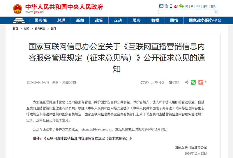 其实,此次总局发布的《通知》,早已不是直播市场第一次迎来政策监管。仅以11月份为例, 6日,市场监管总局制定出台了《市场监管总局关于加强网络直播营销活动监管的指导意见》;13日,国家互联网信息办公室发布了关于《互联网直播营销信息内容服务管理规定(征求意见稿)》公开征求意见的通知。