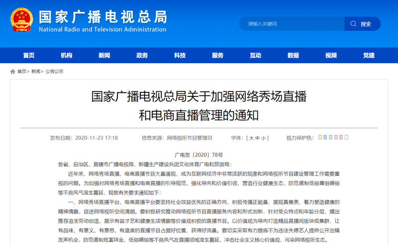 23日,国家广播电视总局发布了《国家广播电视总局关于加强网络秀场直播和电商直播管理的通知》,针对当下火热的直播行业,《通知》提出了包括一线审核人员与在线直播间数量总体配比不得少于1:50,对网络主播和“打赏”用户实行实名制管理,对头部直播间、头部主播及账号、高流量或高成交的直播带货活动进行重点管理等在内的九项具体要求。