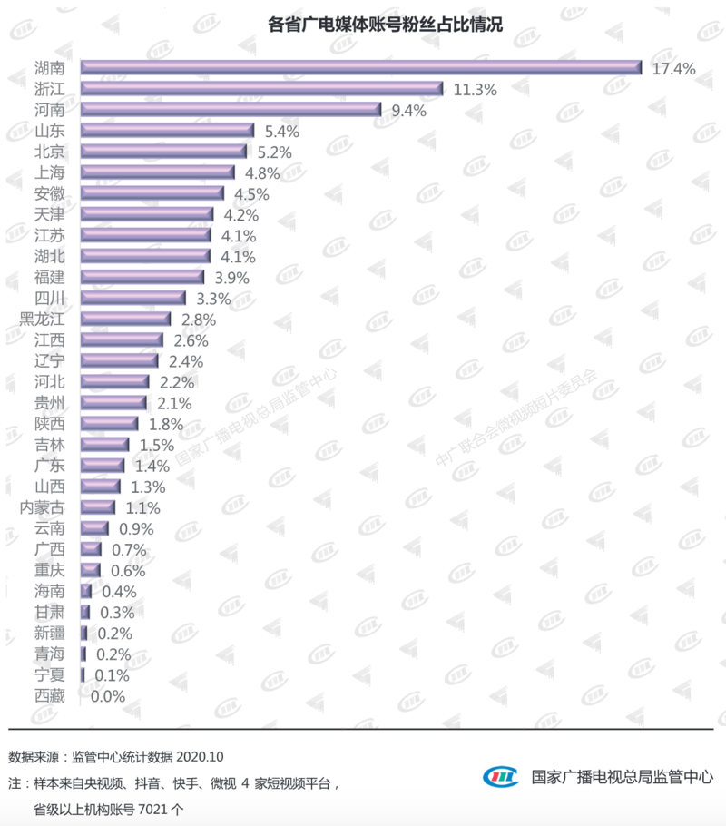 2020年,中央级广播电视机构在抖音、快手的账号数为294个,省级广播电视账号5716个。较2019年同比分别增长165%和746%。央视新闻、 新闻联播、央视网等账号领跑,其他总台频道、知名栏目、主持人账号持续发力,粉丝量超3.4亿。山东、黑龙江、浙江、河南、湖南、辽宁广播电视,短视频平台账号数量超过300个。湖南广播电视短视频粉丝量近3亿,占全国广播电视短视频粉丝量的17.4%,影响广泛,位居第一。浙江、河南、山东、北京、上海等地次之。