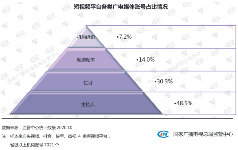 2020年,广播电视等主流媒体全面挺进主战场、进军网上、深入网上态势明显。截至2020年6月,超13000个政务机构、超8000家媒体机构号,5000家媒体达人号加入快手“老铁”行列。省级以上广播电视100%入驻短视频平台,呈现组织机构、频道频率、栏目节目、主持人四层金字塔结构。其中广播电视栏目主持人的短视频账号占比48.5%;栏目、节目的短视频账号占比30.3%。