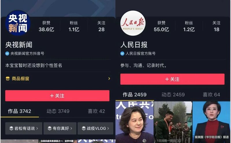 2020年,广播电视等主流媒体短视频围绕疫情防控、复工复产、决胜小康决战脱贫等主题,及时发布权威声音,回应社会关切,成为网民获取信息的主要渠道之一。一批亿级流量的短视频主流网红大V,一系列现象级正能量内容涌现出来。人民日报、央视新闻、新闻联播等账号,成为2020年中国短视频的绝对网红,在快手平台上的粉丝量高居排行榜前十;抖音平台上人民日报账号粉丝量高居榜首,是第一个粉丝量过亿的媒体公众号,央视新闻紧随其后粉丝量也超过一亿。