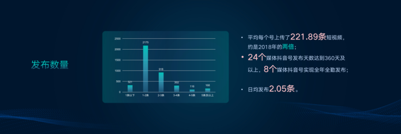 4.调查显示,样本媒体抖音号2019年共计发布的短视频有822826条,平均每个号上传了221.89条短视频,约是2018年的两倍。