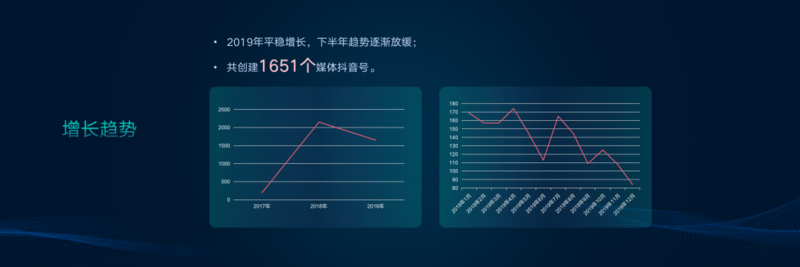 1.2019年,共创建1651个媒体抖音号,增速较2018年有所放缓,说明其数量进入平稳增长期。总体来说,2019年上半年延续了2018年较强的增长势头,但随着越来越多媒体的入驻,媒体抖音号的数量趋于饱和,下半年呈逐渐放缓趋势。
