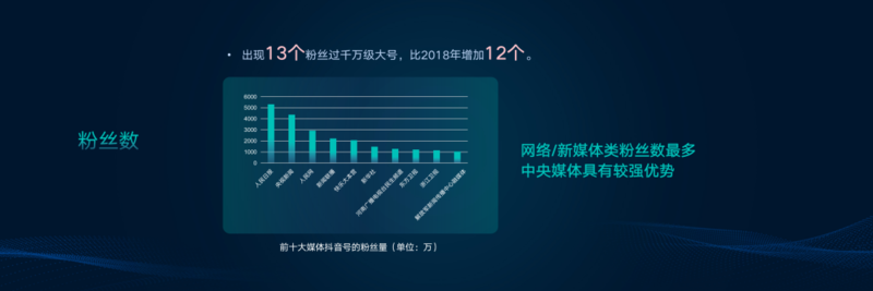 2019年,随着媒体数字化、移动化转型步伐的进一步加快,从中央到地方各级融媒体中心建设的规模化推进,优质媒体原创内容和互联网聚合平台之间的融合与对接更加紧密,媒体抖音号的规模、影响力和公信力也显著提升。