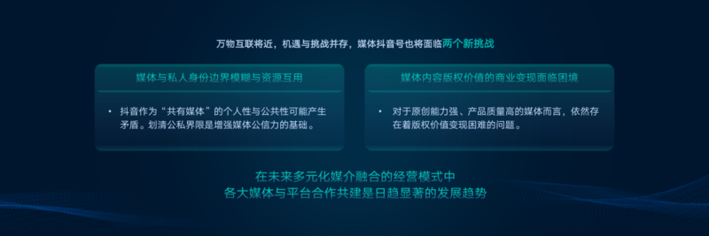 万物互联将近,机遇与挑战并存,媒体抖音号也将面临两个新挑战:一是媒体与私人身份边界模糊与资源互用。二是媒体内容版权价值的商业变现面临困境。