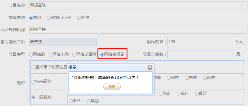 在“重点网络影视剧信息备案系统”进行申报时,勾选“网络微短剧”,会自动跳出“网络微短剧:单集时长10分钟以内”的提示窗口。