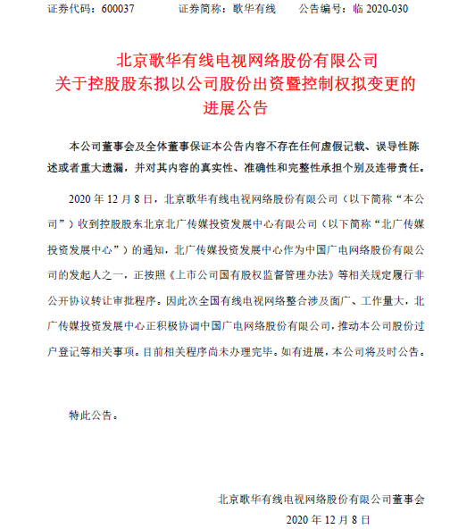不过,就目前来看,全国一网整合也只是完成了万里长征的一步。一方面,目前各地广电股权归属关系十分复杂,整合中仍面临资产评估、股份梳理、利益协调等系列挑战。在中国广电网络股份有限公司成立两个月之久,仅有电广传媒确认湖南有线完成51%股份过户至中国广电。而对于中国广电可期借壳上市的歌华有线原本计划中国广电网络股份有限公司成立后一个月内实现过户登记、完成实缴,但如今仍未取得有效进展。12月8日,北京歌华有线电视网络股份有限公司发布公告(如下图),一定程度上也能看出各省在出资认缴层面就面临不小的难度。
