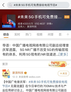 那么,广电如何利用700MHz,与三大电信运营商形成错位竞争?12月3日,中国广播电视网络有限公司副总经理曾庆军给出答案是:基于5G 700M网络全新能力,实现5G NR广播功能。据曾庆军介绍,5G NR广播不会改变5G传输层现有的体系,而是利用5G现有的NR通道让所有5G终端都能播放数字电视,并且基于这种广播技术,未来5G手机可免费接收电视节目,无需流量。此番讲话在微博上引起热议,当天就引发千万阅读量,并且连续4天达到百万以上阅读量。