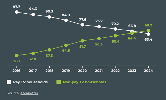 美国是剪线增长最快的市场之一,到2021年付费电视用户数量将下降至7370万户,2024年非付费电视用户的数量将超过付费电视用户。
