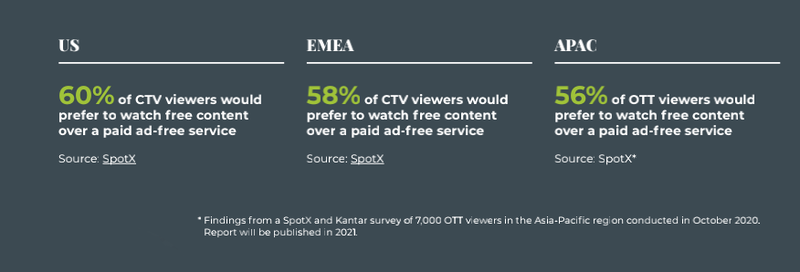 飞速增长:2018年美国CTV日均观看时长为46分钟。如今,CTV用户每天收看3小时的节目,而且这个数字在疫情期间继续攀升。亚太地区的OTT观众日均花3个小时观看视频内容,在疫情期间,大多数人还增加了1-2小时。