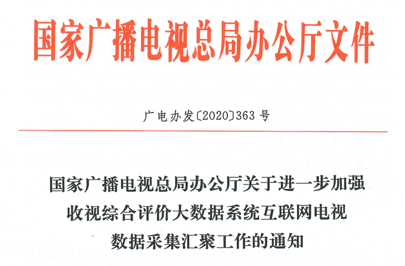 流媒体网独家获悉:国家广播电视总局办公厅近日给七大互联网电视牌照主体下发《关于进一步加强收视综合评价大数据系统互联网电视数据采集汇聚工作的通知》(363号文),要求其所辖持有互联网电视集成牌照的相关播出机构,做好督将互联网电视全量用户收视数据真实、完整、长期、实时地采集汇聚到广播电视节目收视综合评价大数据系统。其中互联网电视全量用户数据来源包括但不限于智能电视机、互联网电视机顶盒、互联网电视客户端等。文件提供了《收视综合评价大数据系统数据对接方案(互联网电视)》(见后文附件),并要求2021年1月底前完成数据对接工作。