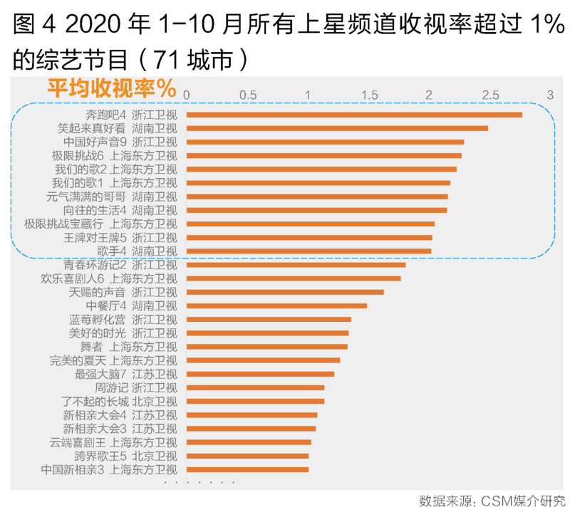 在今年众多老牌“综N代”节目当中,《奔跑吧第四季》在71城市的平均收视率近3%,遥遥领先其他综艺节目,居于首位;浙江卫视《中国好声音第九季》、上海东方卫视《极限挑战第六季》《我们的歌第一季》《我们的歌第二季》、湖南卫视《向往的生活彩云篇》《歌手第四季》、浙江卫视《王牌对王牌第五季》表现稳健,平均收视率均在2%-2.5%。值得注意的是,在收视率超过2%的11档综艺节目中,湖南卫视的喜剧创演艺能秀节目《笑起来真好看》和代际互动观察类游戏节目《元气满满的哥哥》是两档今年全新推出的综艺节目,收视远超其它新生综艺(图4)。