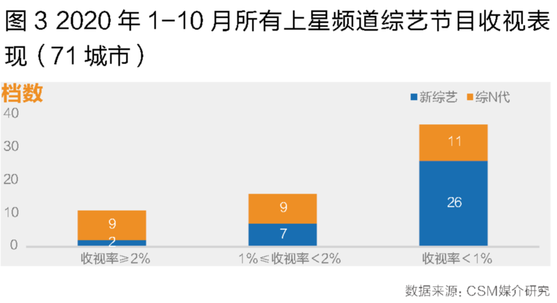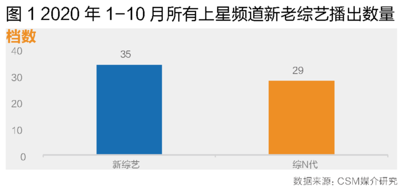近几年的综艺节目市场,多档“综N代”节目持续发力,有些老牌“综N代”已行至第九季,更加细分、更加多元的新生综艺也不断涌现。从综艺节目的播出数量来看,2020年1-10月所有上星频道播出的综艺节目共64档[1],其中新生综艺35档,“综N代”节目29档,新老综艺占比分别为55%和45%,新生综艺在播出数量上已超过“综N代”节目(图1)。