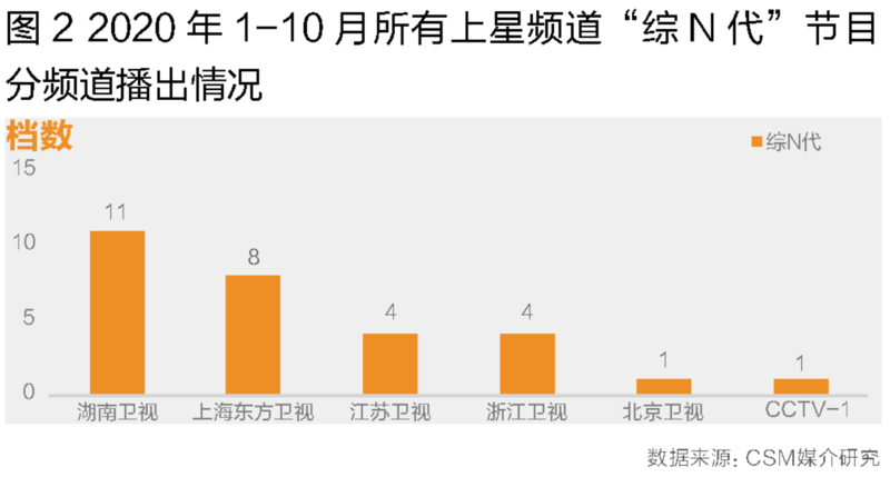 从“综N代”节目在各平台的分布来看,多集中在头部上星频道;其中上海东方卫视与湖南卫视的“综N代”节目播出数量遥遥领先,分别为11档和8档,如上海东方卫视的《欢乐喜剧人第六季》《极限挑战第六季》等和湖南卫视的《歌手第四季》《向往的生活彩云篇》等;其次是江苏卫视与浙江卫视,各播出4档“综N代”节目,包括江苏卫视的《新相亲大会第三季》《新相亲大会第四季》《最强大脑第七季》等和浙江卫的视的《王牌对王牌第五季》《奔跑吧第四季》《中国好声音第九季》等;北京卫视与中央台“综N代”节目播出数量较少,各有1档,分别是北京卫视的《跨界歌王第五季》和中央电视台综合频道的《挑战不可能第五季》(图2)。