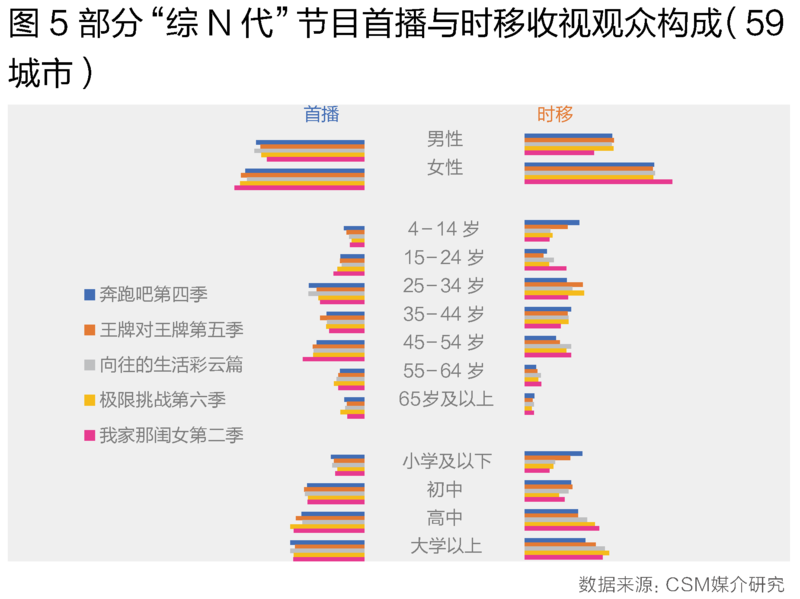 在《奔跑吧第四季》《王牌对王牌第五季》《向往的生活彩云篇》《极限挑战第六季》和《我家那闺女第二季》这五档节目中,从性别构成来看,女性观众都较男性观众更高,且时移收视中女性观众比例更大,说明其点播/回看的主动性更强。其中,《奔跑吧第四季》和《向往的生活彩云篇》这两档节目的男女观众构成比例差异最小,相差仅不到5%。