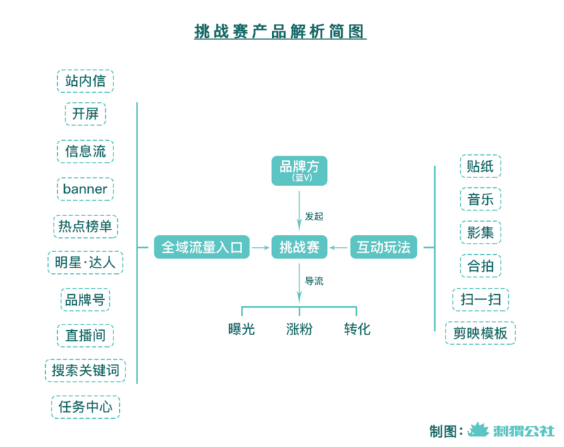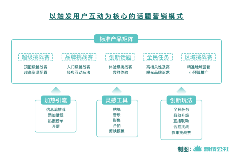挑战赛本身是非标准化的,但抖音主端的话题聚合页、视频样式、产品形态都是标准化的。这种标准化赋予了挑战赛标准化的机会和可能,通过挑战赛连接其他产品,完成整个挑战赛营销链路。